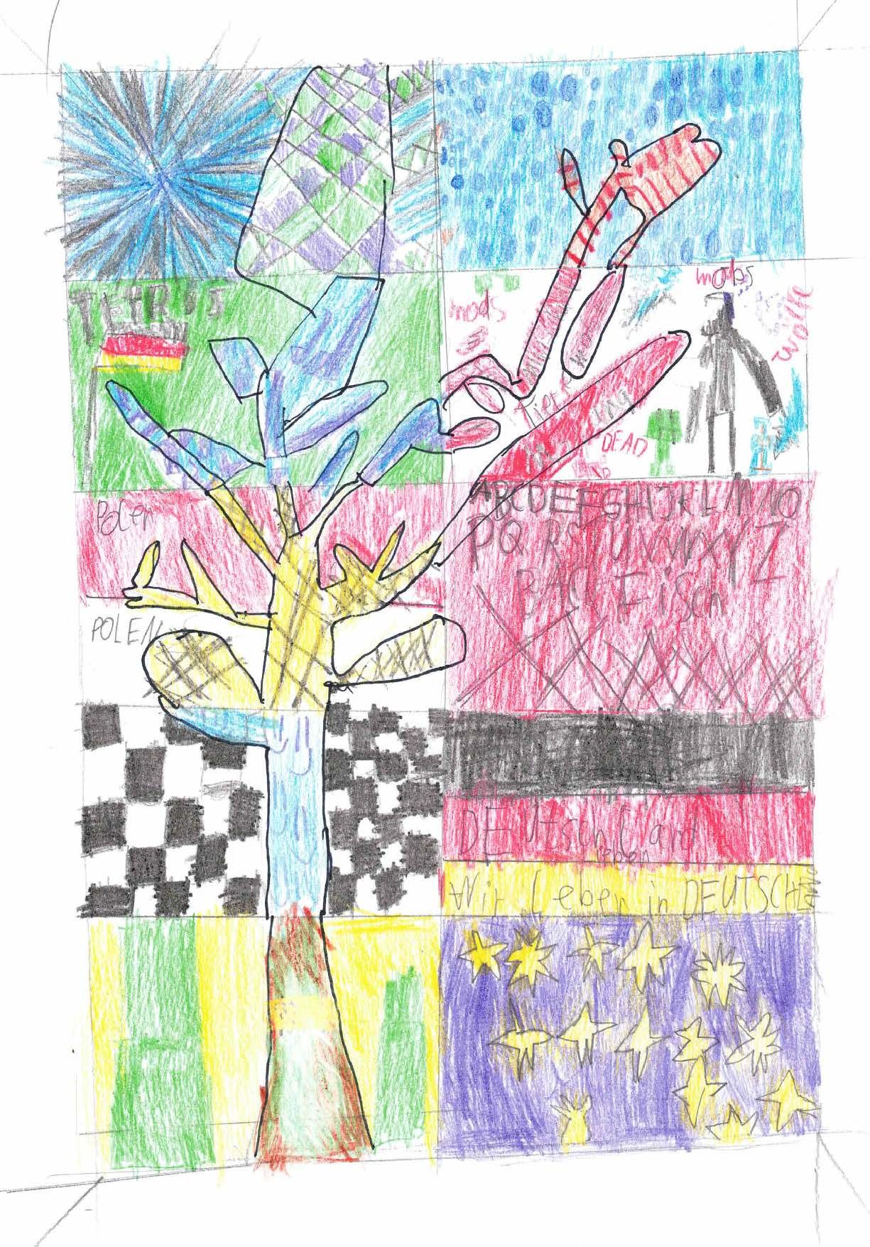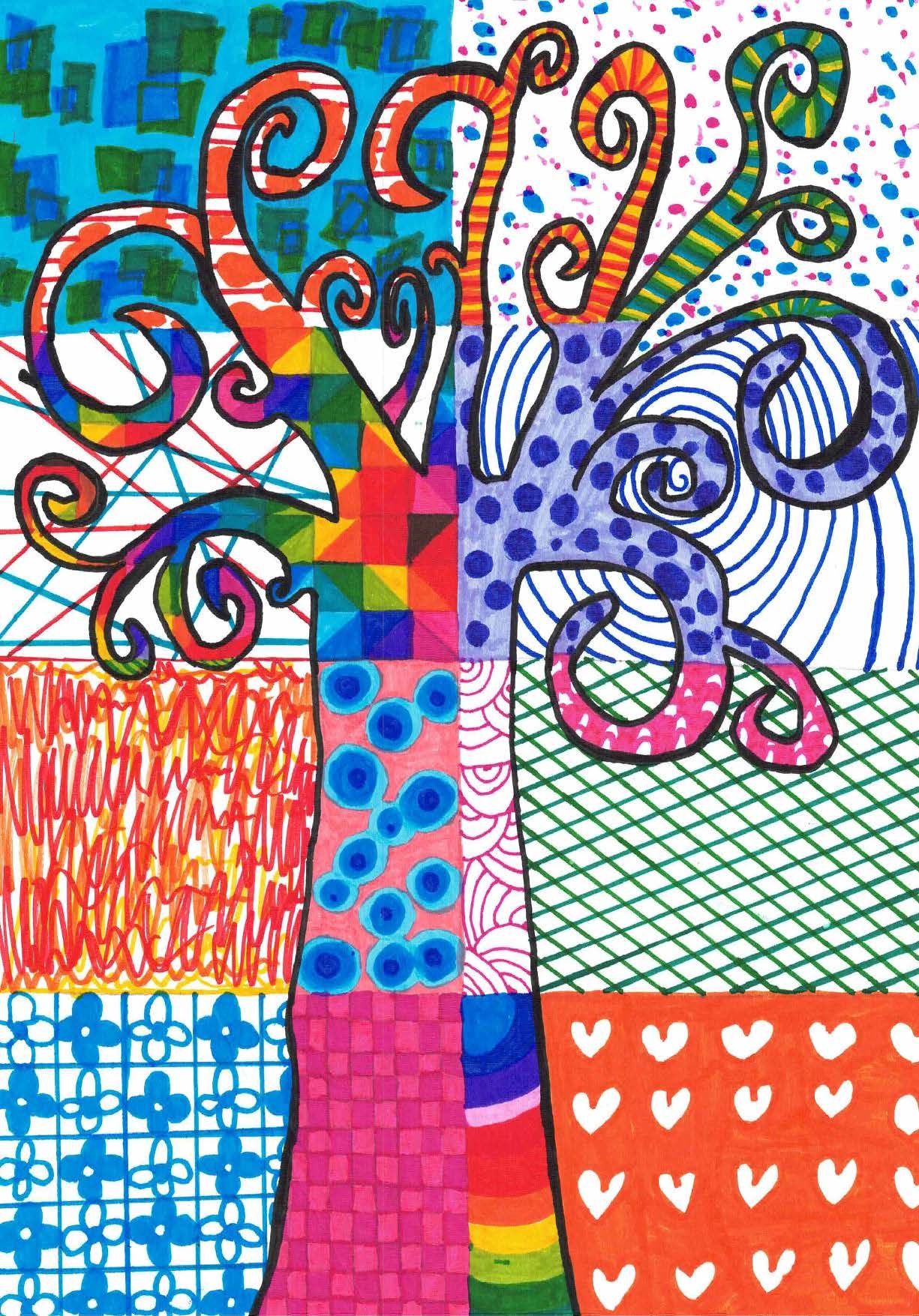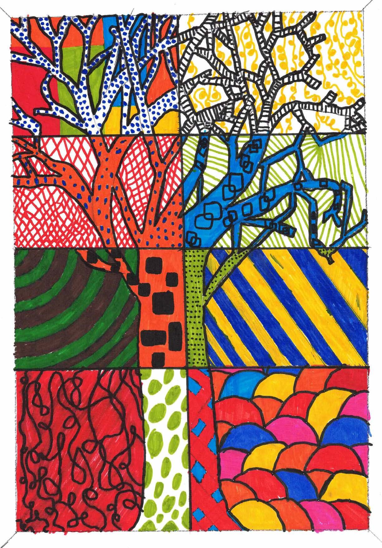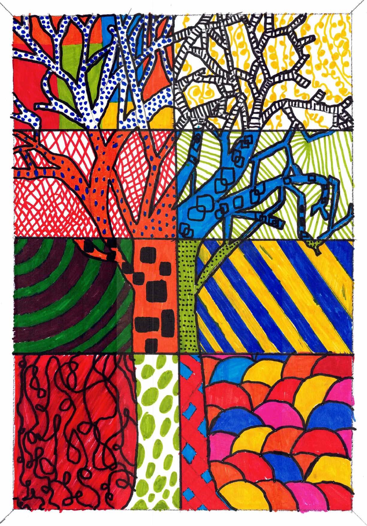 Viele Kästchen, ein Baum – und unendlich viele Ideen: Die Klasse 5b gestaltete im Kunstunterricht fantasievolle, surrealistische Bäume auf einem in Felder eingeteilten A4-Blatt.