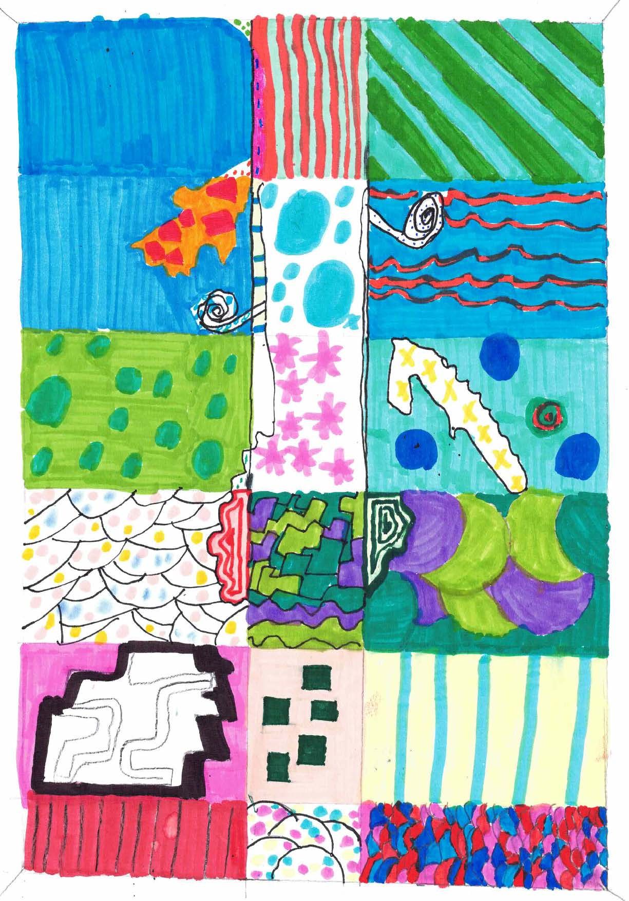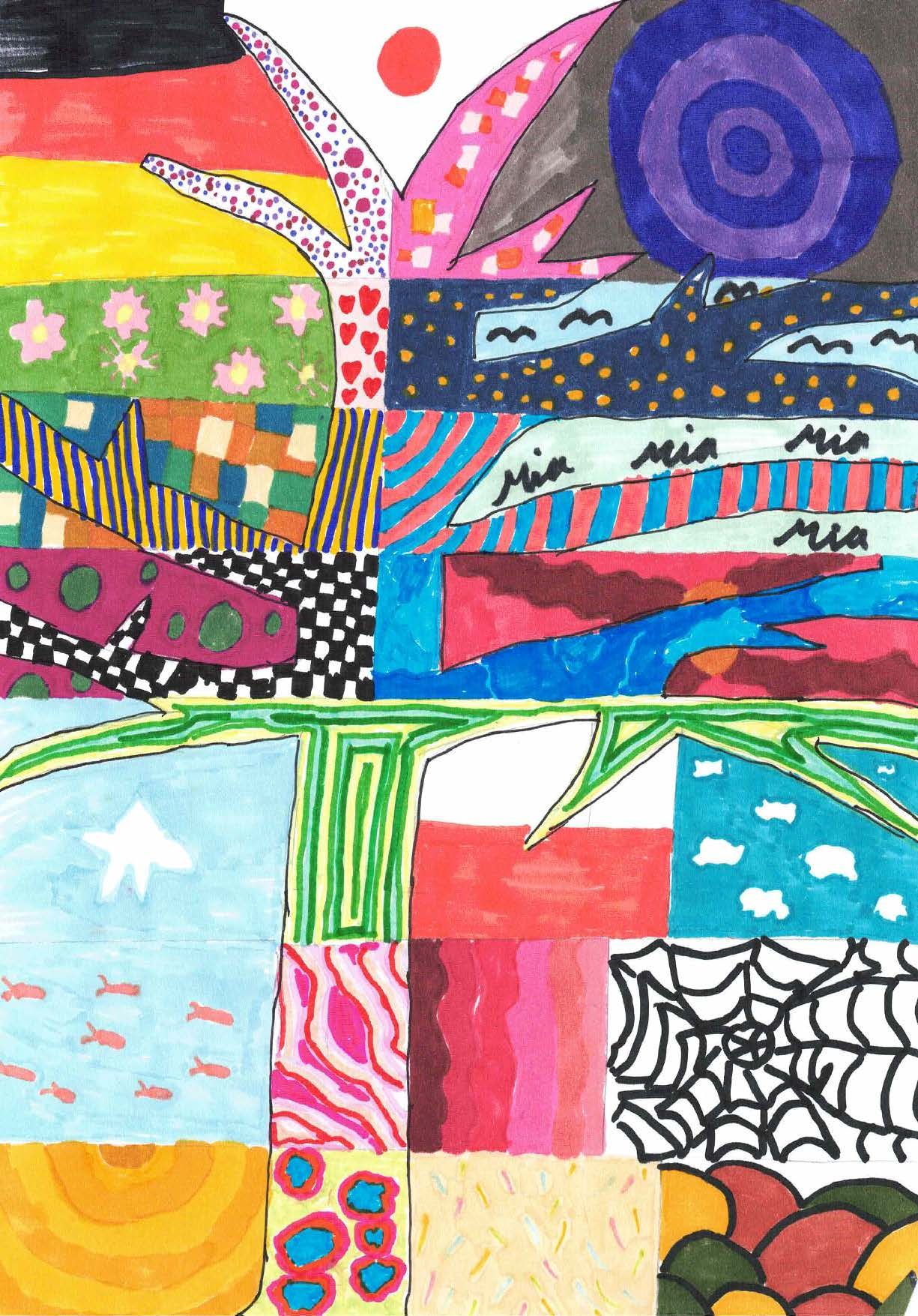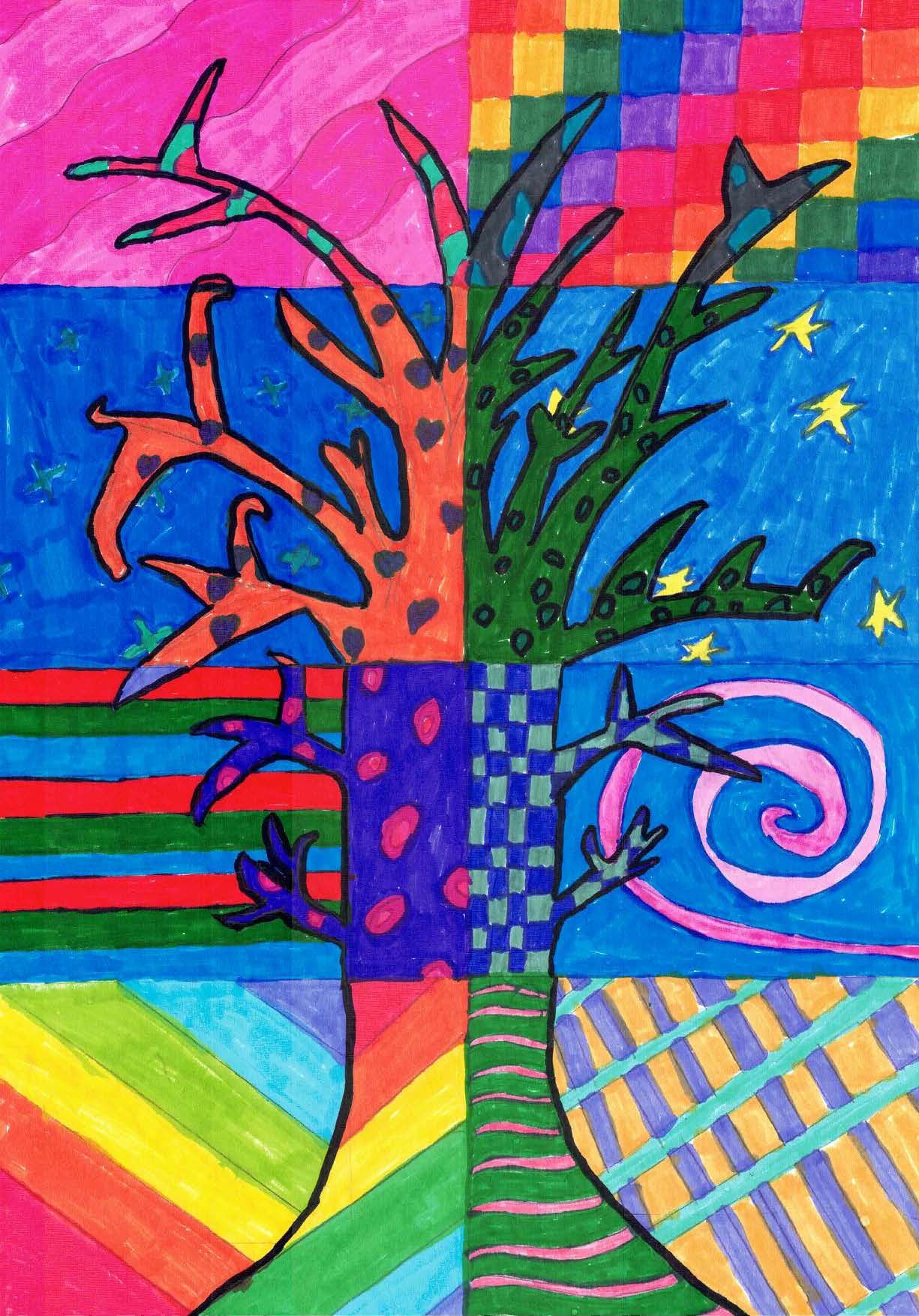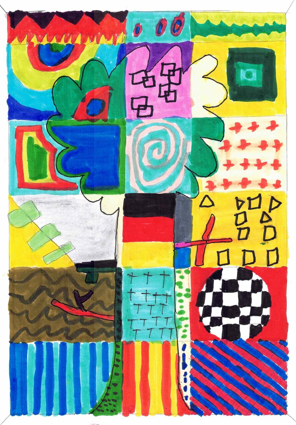 Viele Kästchen, ein Baum – und unendlich viele Ideen: Die Klasse 5b gestaltete im Kunstunterricht fantasievolle, surrealistische Bäume auf einem in Felder eingeteilten A4-Blatt.
