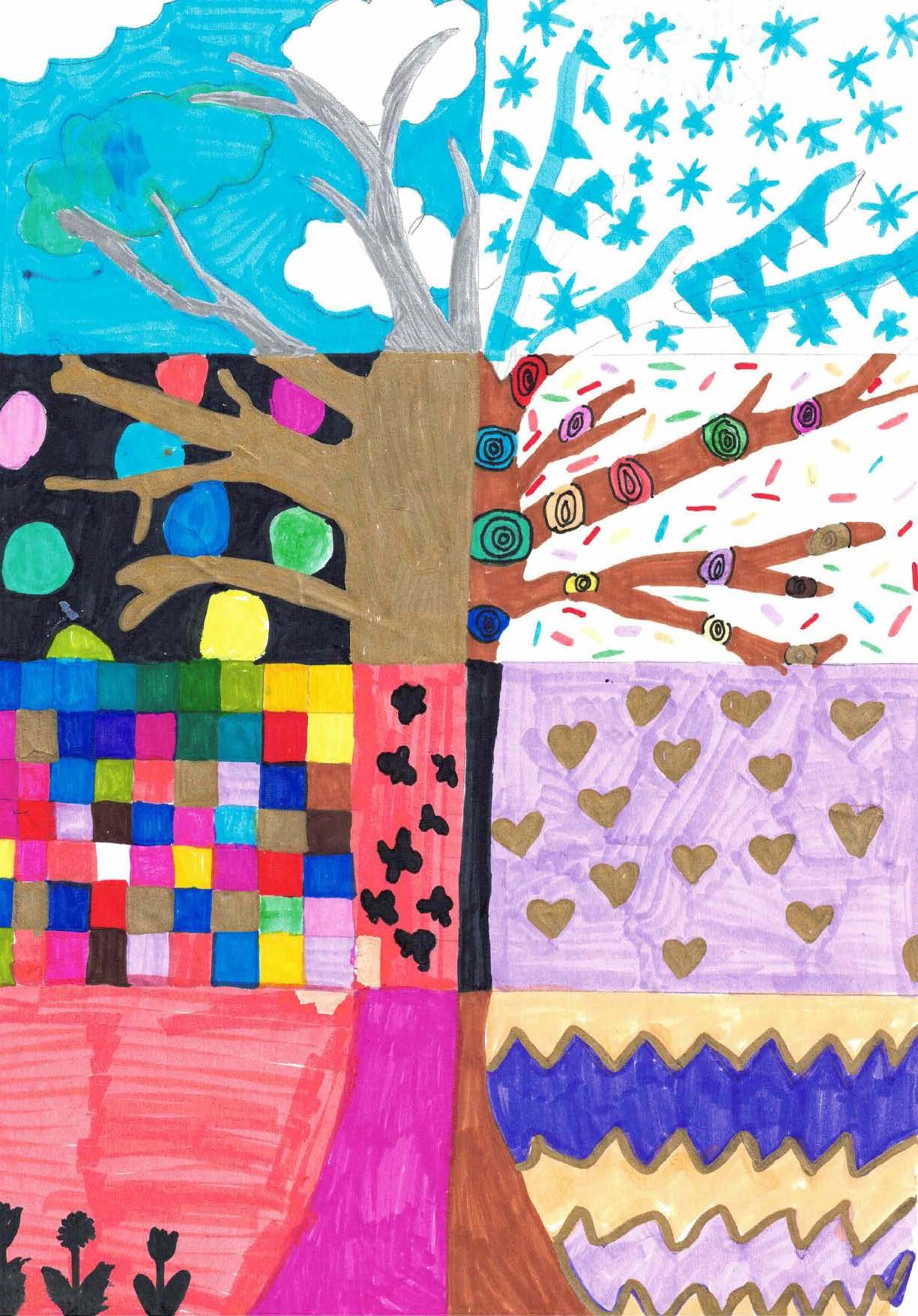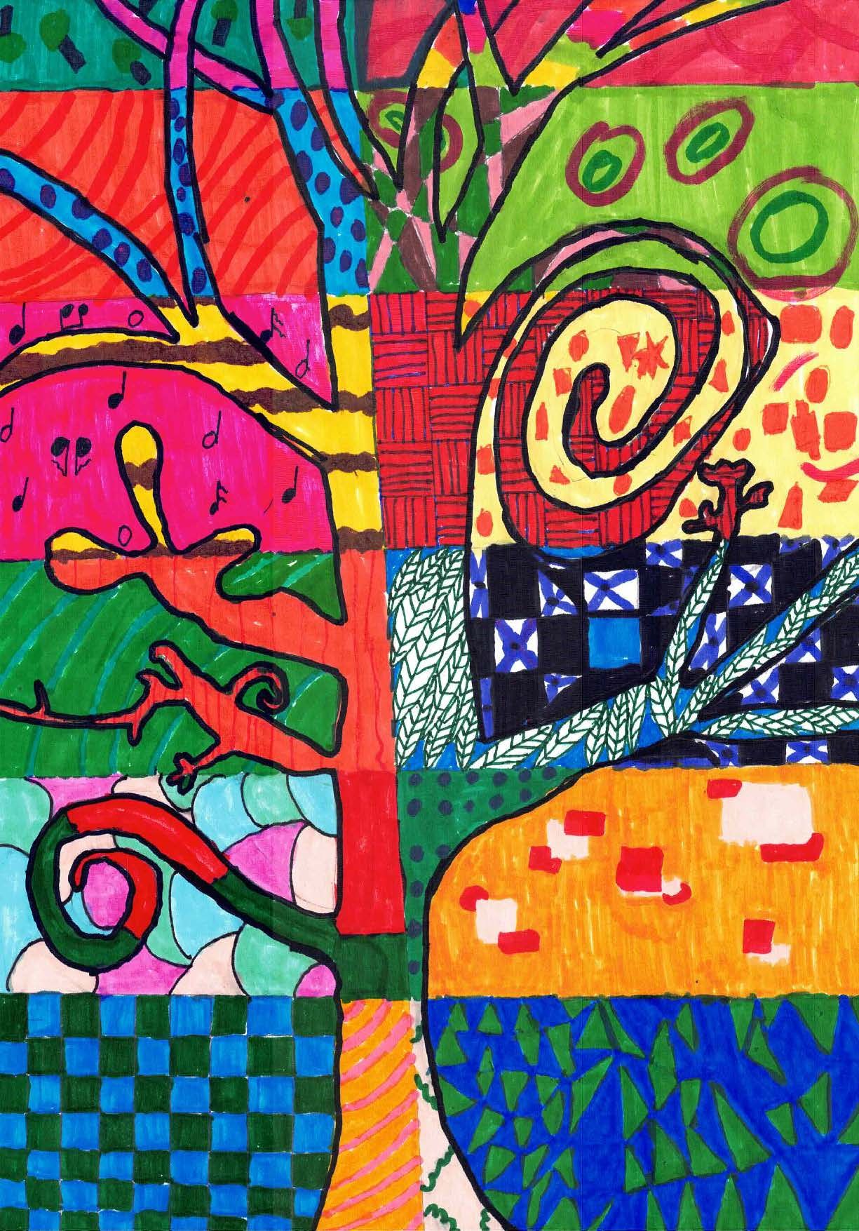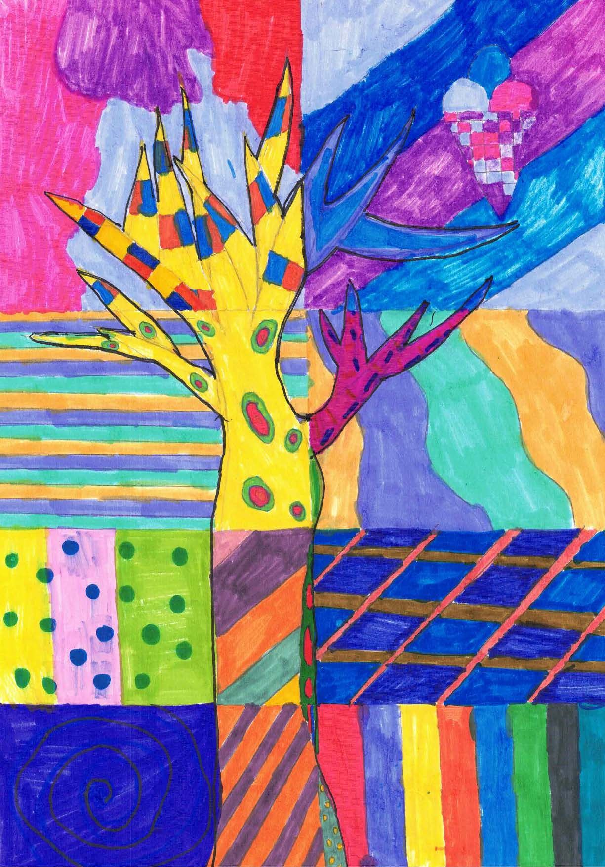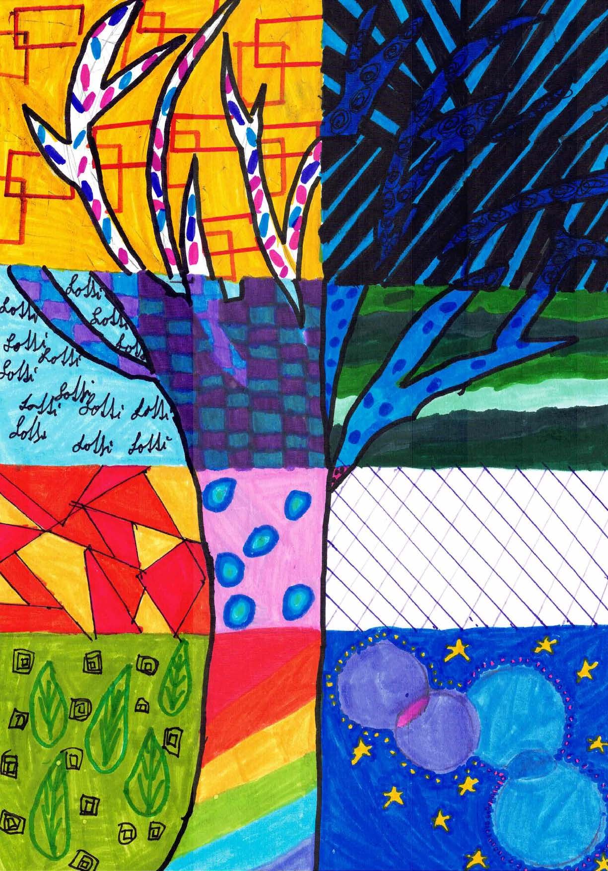 Viele Kästchen, ein Baum – und unendlich viele Ideen: Die Klasse 5b gestaltete im Kunstunterricht fantasievolle, surrealistische Bäume auf einem in Felder eingeteilten A4-Blatt.