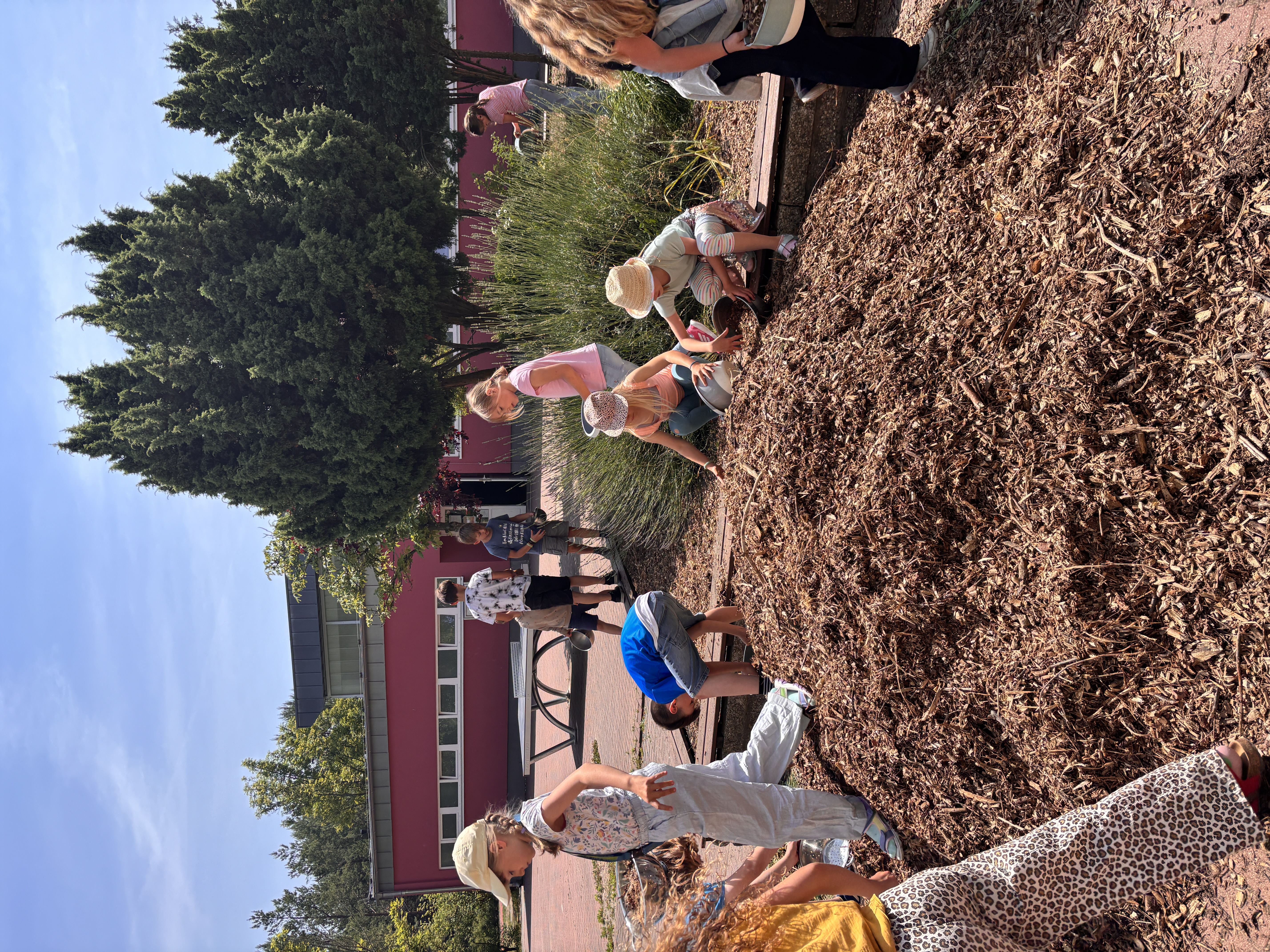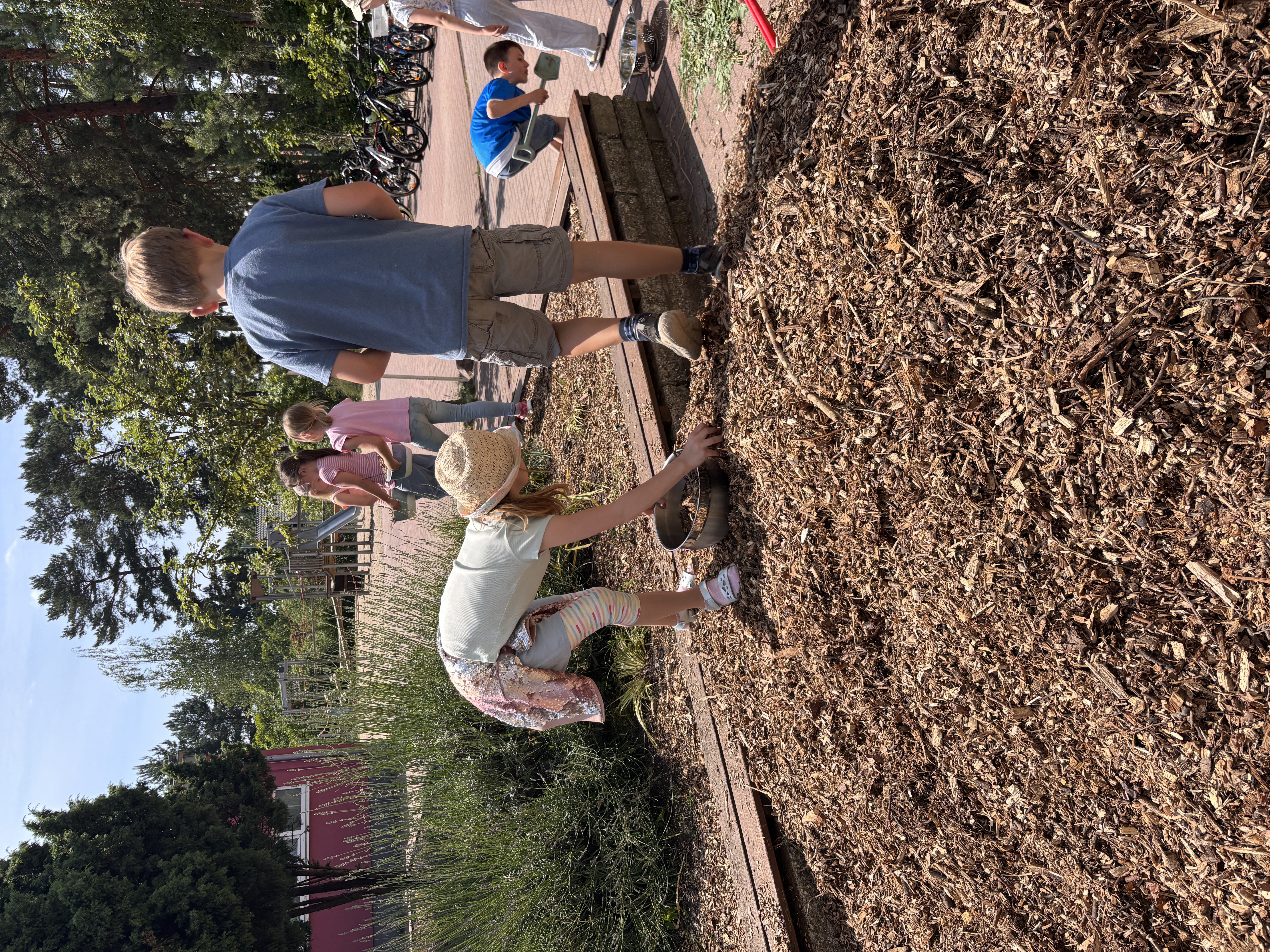 Hackschnitzel mit Klasse 3 auf unserem Schulhofbeet verteilen